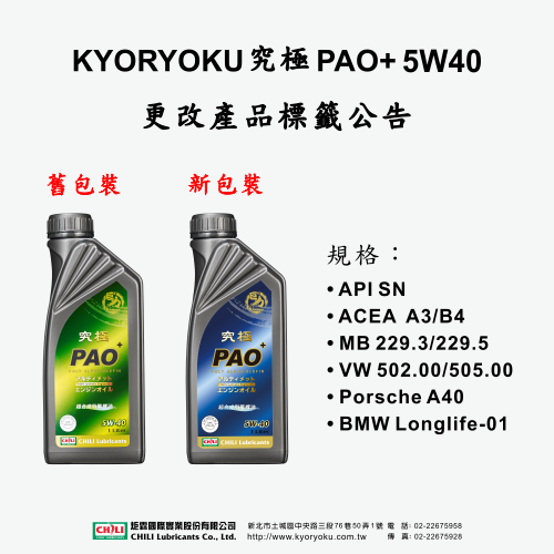 為提升究極系列產品辨識度,即日起『究極5W40 PAO+』標籤顏色將從深綠色改為深藍色;除了標籤外觀改版外,產品配方也特別提高鎢元素添加之比例,藉以提升產品的耐溫即抗剪切磨耗,也能有效提升產品的抗氧化性,在每次啟動的瞬間,就給您的愛車引擎源源不絕的呵護。