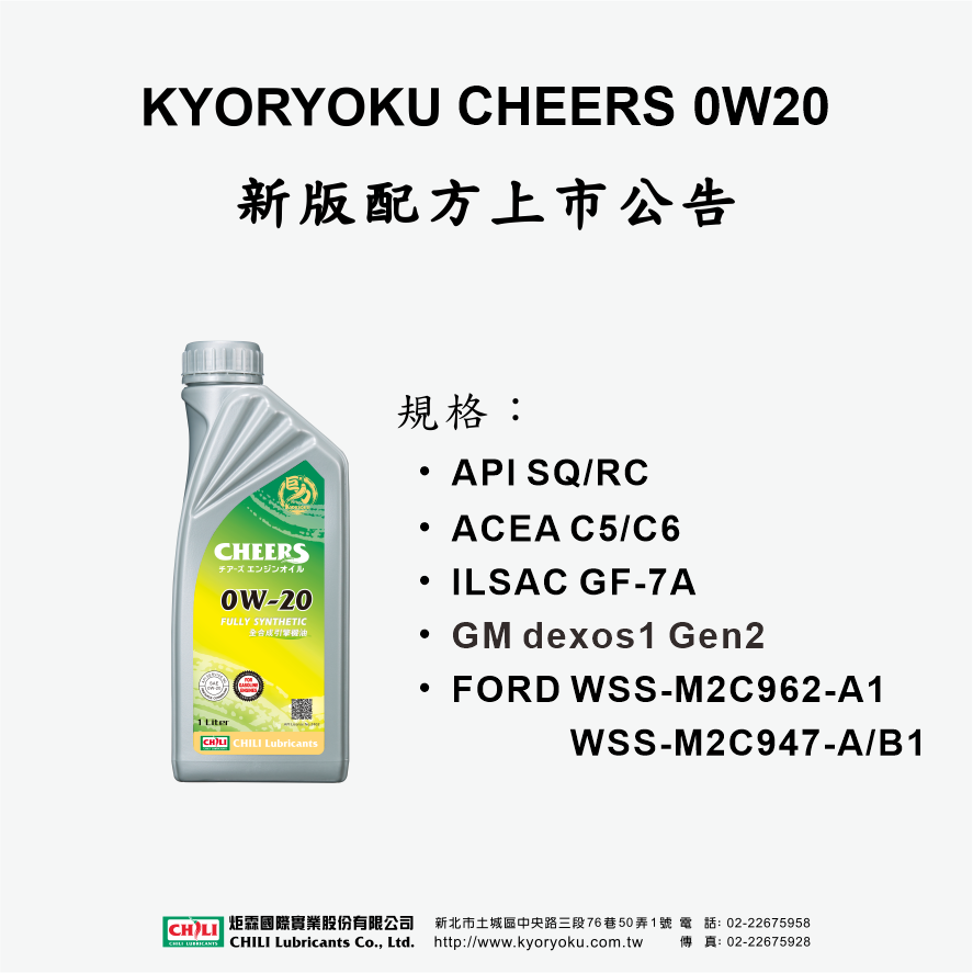 ► 說明: 為因應市場需求,『CHEERS 0W20』推出配方升級的新版本,除了通過美國石油學會最新 API SQ/RC 與 ACEA C5/C6 ,並且符合 ILSAC GF-7A 節能認證,有效提高燃油效率。 ► 注意事項: • 本產品汽油車與柴油車通用。 • 可減少柴油車的廢氣排放及對環境之傷害,延長碳微粒過濾器(DPF)的壽命。 • 適合最新配有汽油微粒子濾清器(GPF),且符合多款日系(HONDA)及歐系(VOLVO)配有GPF之引擎車輛。